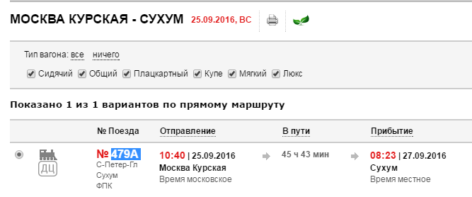 С московского железнодорожного вокзала ходит ежедневно поезд №479А в Сухум. Время в пути составляет достаточно много - почти 46 часов. Однако, минусом вряд ли это можно считать, так как пограничный контроль можно пройти не выходя из вагона, сидя на своем месте и займет он не больше часа. Более того, в Абхазии поезд проезжает медленней и вы можете наслаждаться видами из окна. Расписание поезда можно посмотреть на Курском вокзале. К примеру, завтра в 10:40 будет отправляться поезд на Сухум.