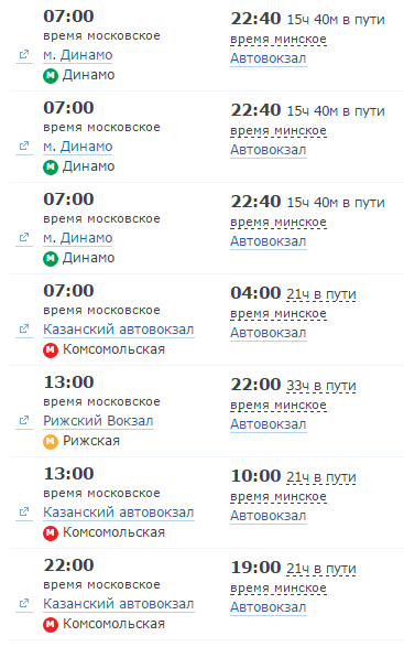 Каждый вторник и пятницу с м. Динамо в 7 утра отправляется транзитный рейс Москва-Брест. Прибытие на конечную остановку через 15 часов 40 минут, ориентировочный час 22.40.