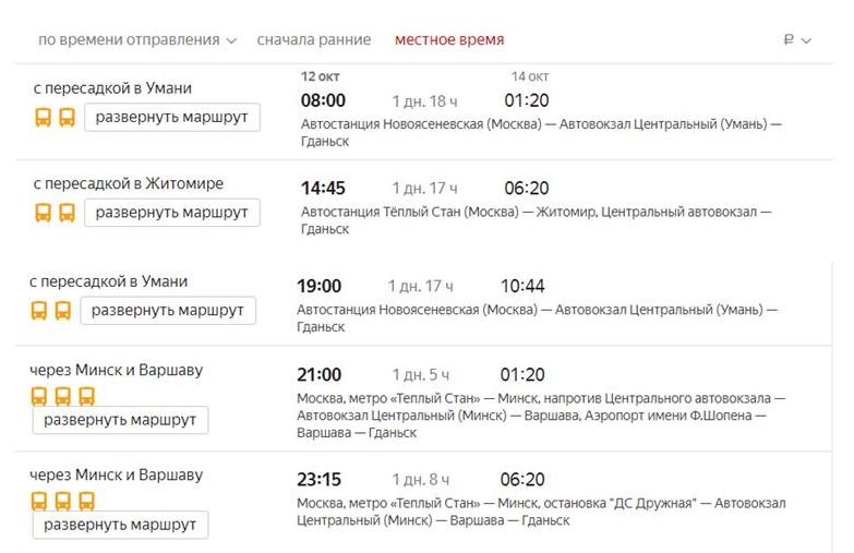 Ниже приведена информация о том, сколько часов вам потребуется, чтобы добраться от Москвы до Гданьска, а также приведена примерная стоимость проезда (средняя цена билета) на том или ином виде транспорта.