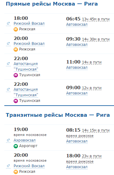 По данному направлению курсирует несколько автобусов - прямые и транзитные, которые отправляются из Москвы только после 18 часов дня и прибывают в Ригу утром. В дороге автобус проводит ориентировочно 12-14 часа.