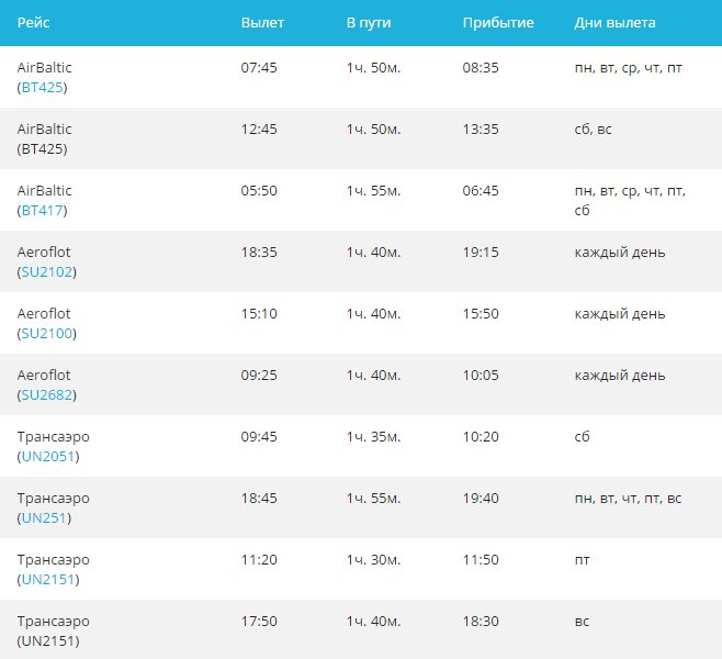 Направление обслуживают несколько международных авиа компаний - Finnair, Belavia, Aeroflot, AirBaltic, Трансаэро, Estonian Air. Регулярность отправки самолетов - ежедневно. Из Москвы три аэропорта осуществляют отправку авиа рейсов - Внуково (VKO), Шереметьево (SVO) и Домодедово (DME). В Риге только один - Рига (RIX).