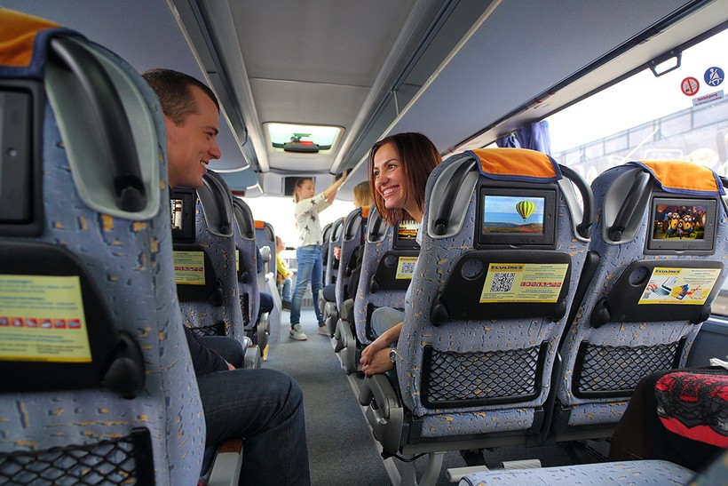 Ехать хоть и долго, но кресла устроены так, что откидываются и можно вздремнуть. На спинке кресел есть небольшие экраны (телевизоры). Можно будет смотреть фильмы, чтобы время пролетало быстрее, и, кстати, вам выдадут бесплатно наушники, чтобы от просмотра ничего не отвлекало. Санузла внутри нет, но водитель по требованию пассажиров будет останавливаться.