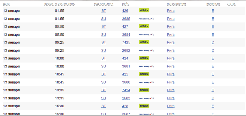 Рейсы Москва - Рига (расписание на 13.01.2017)