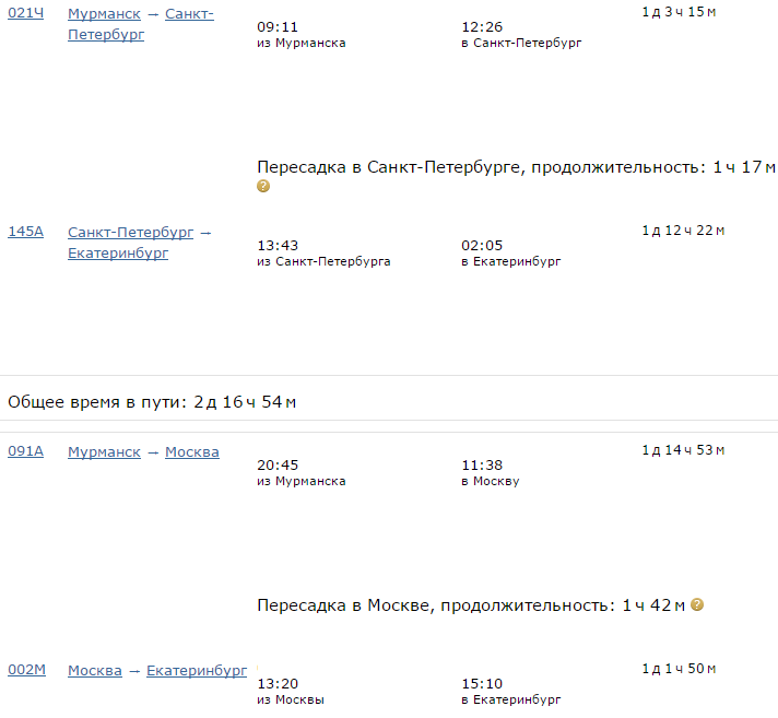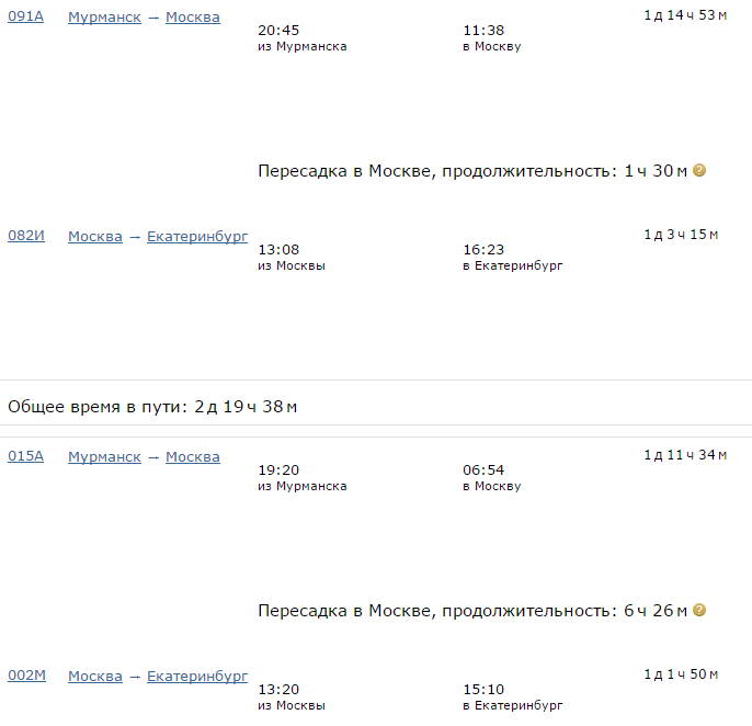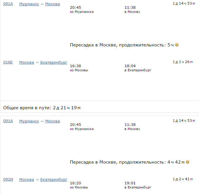 С красивого северного города России Мурманск в Москву и Санкт-Петербург ходит очень много пассажирских поездов. Удобнее будет ехать поездами, что отправляются в 09.11, 19.20 или 20.45. В таком случае комфортно пересаживаться на поезд до Екатеринбурга.