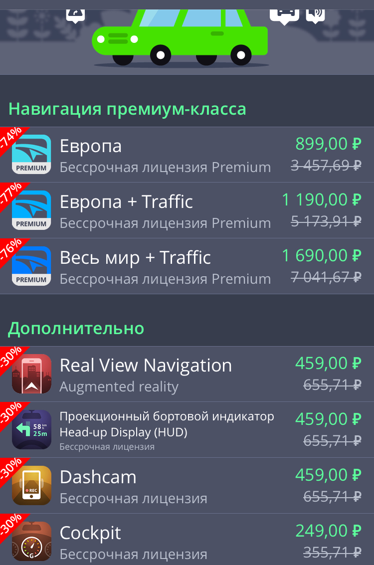 При автопутешествиях по остальному миру я применяю навигационное приложение Sygic. В нем мне не очень нравится дизайн и небольшая корявость в оптимизации, но зато он пока ни разу меня не подводил на деле, исправно направляя до нужного места в любой стране Европы и в США. Карты стоят денег, но часто бывают скидки и можно купить бессрочный доступ ко всему миру за 1400 руб и больше никогда не платить. Сервис достаточно регулярно обновляется и навигатор знает все актуальные скоростные ограничения и новые дороги (только самые новые не знает). Но в России пользоваться лучше чем-то отечественным.