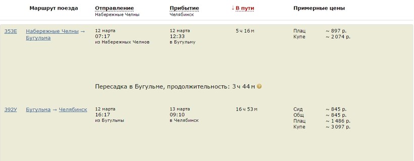Цены железнодорожных билетов, Набережные Челны – Челябинск (с пересадкой в Бугульме), по данным на март 2016 года.
