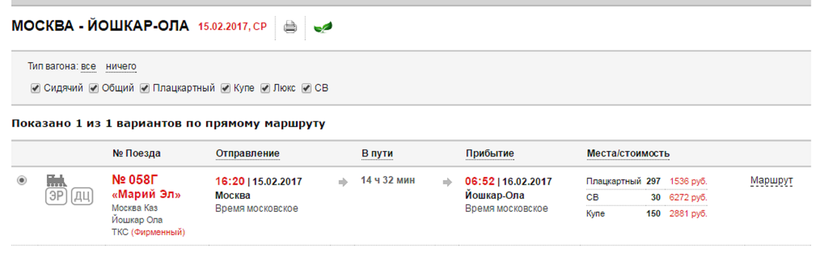 - Из Сергача до Йошкар-Олы купе стоит 1956 рублей, СВ 4062 рубля.