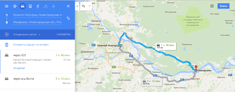 Из Нижнего Новгорода выезжаю по трассе Р159. А уже на кольце съезжаю на дорогу К21 и по ней направляюсь к самому Макарьево. Путь не сложен, важно держаться главной дороги. При подъезде к Макарьево есть очень узкие участки дороги со многочисленными поворотами (например около с. Ивановское, в Валках и т.д.), поэтому нужно быть внимательным.