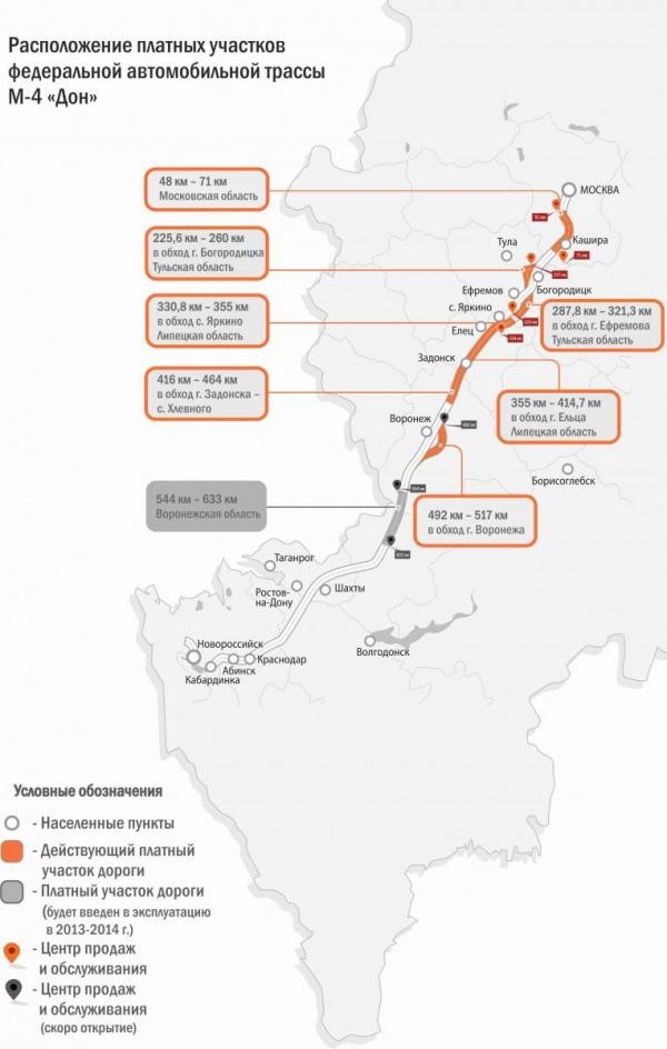 Из Новороссийска в Москву на автомобиле ехать предстоит 1504 км, потратив на поездку, как минимум 17 часов, если практически не останавливаться и не отдыхать. Передвигаться предстоит по федеральной трассе М-4. Она находится в отличном состоянии, и на всем протяжении можно попадаются кафе, туалеты, заправки самых разных производителей. Последнее время здесь появляется все больше платных участков, на которых, вообще, созданы все условия для водителей, начиная от дорожного покрытия, заканчивая сервисом. Те, кто не желают платить деньги за проезд, могут проехать по бесплатному объездному пути. Обычно, указатели оповещают о начале платного участка и направлении объезда. Платить надо на въезде сюда, но чек сохранять следует до окончания этого отрезка, иначе плату потребуют снова. Стоимость проезда по платной дороге зависит от ее длины и колеблется от 25 до 120 рублей с легковых автомобилей днем, ночью цены вдвое ниже. Конечно, за большие транспортные средства плата выше. Расценки всегда можно узнать на информационном щите перед таким участком. Здесь кроме кафе и заправок, на обочинах, можно увидеть столбики с кнопками вызова аварийных комиссаров. Платные участки есть в Воронежской, Липецкой, Тульской и Московской областях.