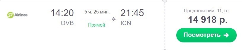 Самолет принадлежит российской компании S7. В остальные дни до Сеула можно добраться только с пересадкой. Ее сделайте, например, в Иркутске. Вот этот вариант.