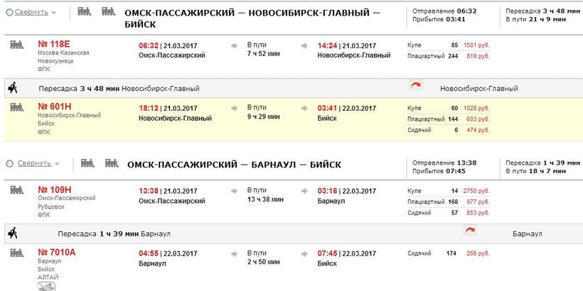 На поезд билеты можно взять в кассах и терминалах на вокзалах станций Омск и Новосибирск-Главный, а также на сайте РЖД. Автобусные билеты покупаются в кассах автовокзала Бийска.