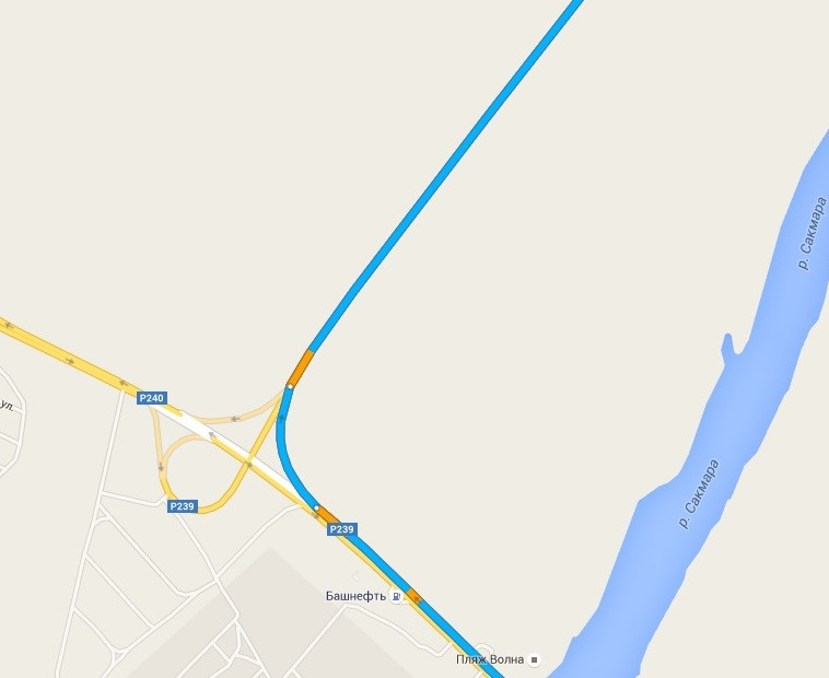 Здесь следует идти, не поворачивая на орское ответвление. Сначала маршрут связан с Р239. После пересечения реки Сакмара – вот она:
