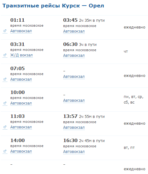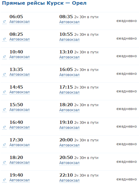 Расписание автобусных рейсов по маршруту Орел-Курск