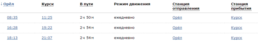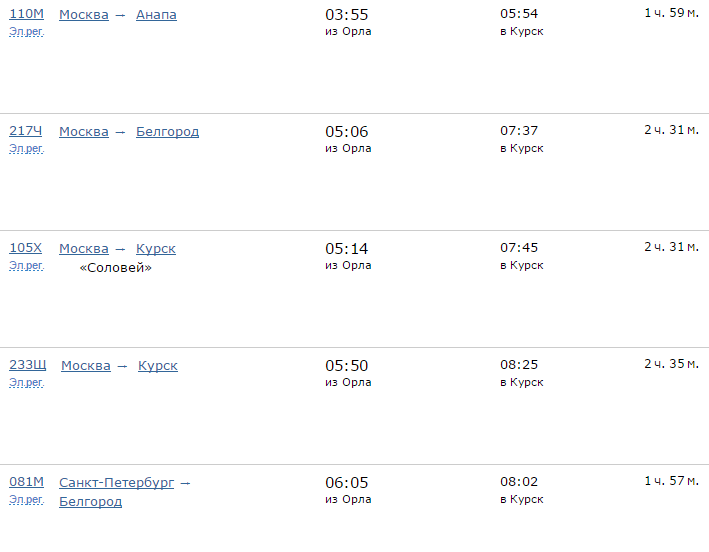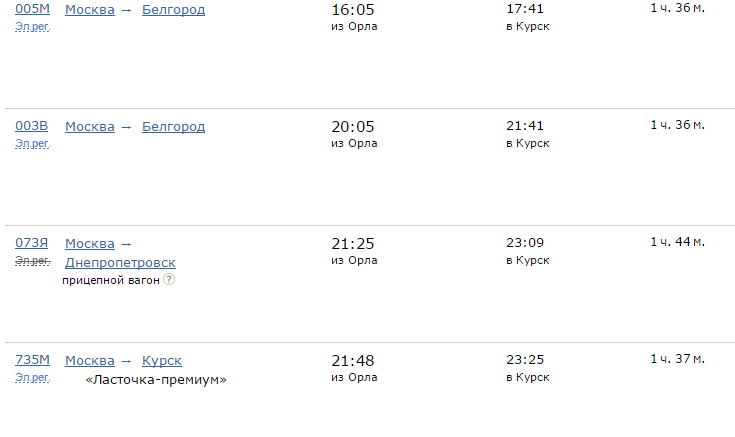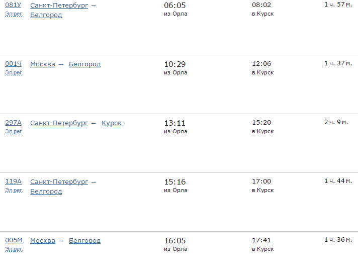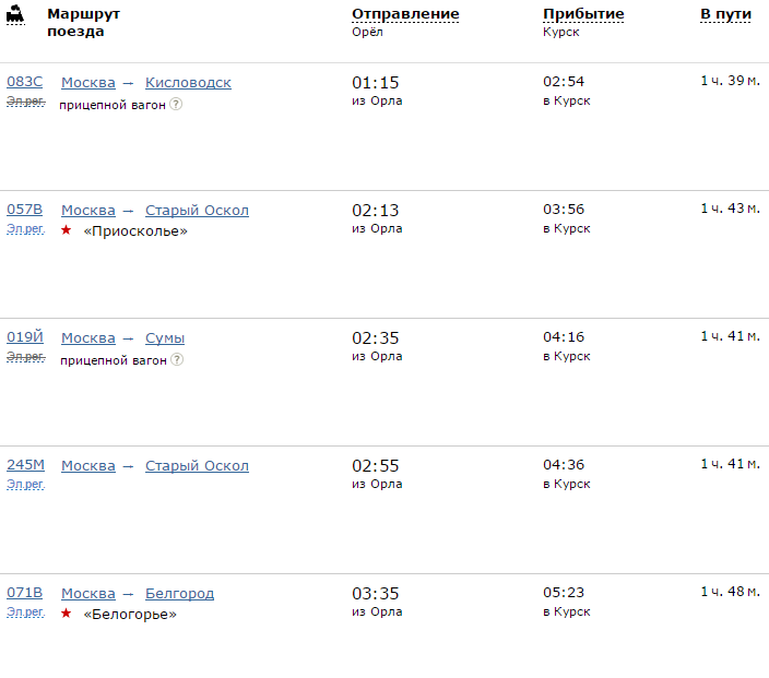 Электрички курсируют в течение дня, отправка происходит в 08.35, 16.28, 18.13. Позднее шести вечера добраться в Курск из Орла можно только на пассажирском поезде.