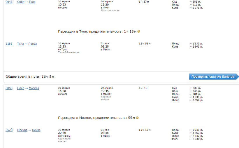 - Орел-Тула, Тула-Пенза. Сначала садитесь на поезд 004В. Он отъезжает из Орла в 10.23. Через два часа вы прибудете в Тулу, и в 13.33 сядете на поезд 318Б «Тула-Пенза». В полтретьего ночи вы будете в Пензе. Мне этот маршрут не нравится по двум причинам. Во-первых, в Тулу из Орла проще и быстрее добраться на автобусе, тем более, ездят они по этому маршруту постоянно, а во-вторых, время прибытия ну уж очень неудобное;