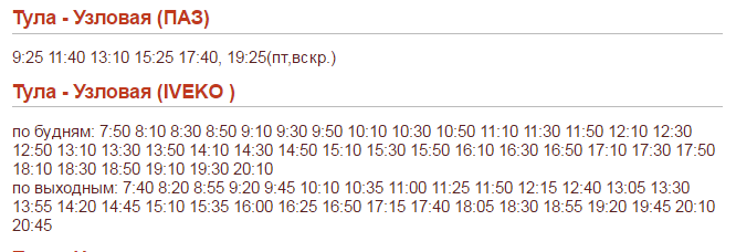 Автобусное сообщение между двумя областными центрами, Орлом и Тулой, достаточно налаженное. Автобус Орел - Тула отправляется ежедневно в 9:30, 10:45, 12:00, 13:30, 18:30. Плюс проходящие автобусы на Москву и Рязань. Время в пути на автобусе до Тулы - три с половиной часа. Приехав на тульский автовокзал, здесь же надо сделать пересадку на автобус до Узловой. Времени на это много не требуется. Автобусы до Узловой следуют с интервалами в 20-30 минут.