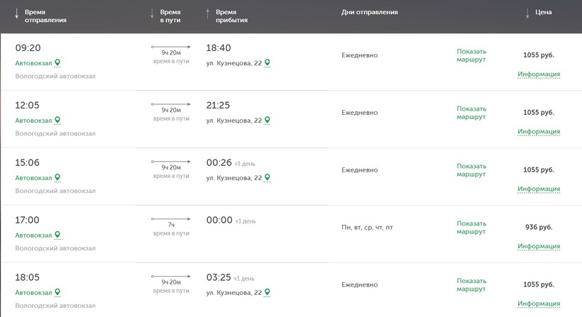 Отсюда же отправляется автобус в направлении Великого Устюга. Самый подходящий рейс в 17:00, ехать 7 часов. В конечную точку автобус прибывает в полночь (не очень удобно).
