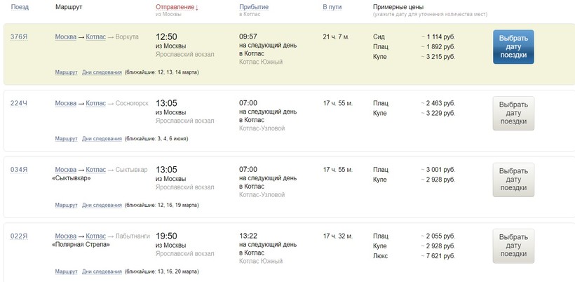Далее нужно перебраться на Ярославский вокзал и сесть на поезд в направлении Котласа. Здесь есть несколько вариантов. Самый оптимальный из них отправляется около часа дня, а прибывает около десяти утра на следующий день.