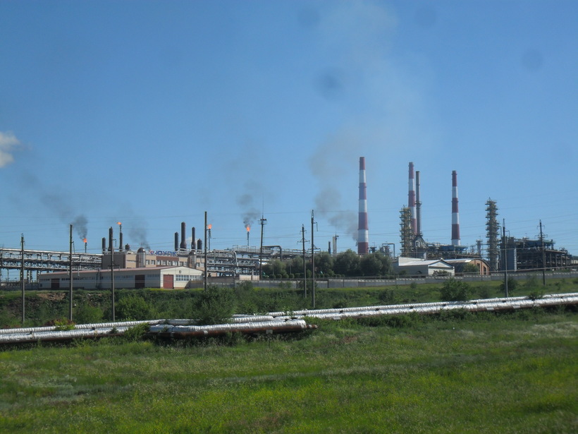 мы останавливались под Оренбургом перекусить и передохнуть. В Оренбург не заезжаем, чтобы время не тратить, едем по объездной. Дальше дорога тоже нормальная, только на объездной Орена (мы сокращенно так называем Оренбург) могут быть пробки, особенно в пятницу. За Ореном можно полюбоваться факелами газоперерабатывающего завода.