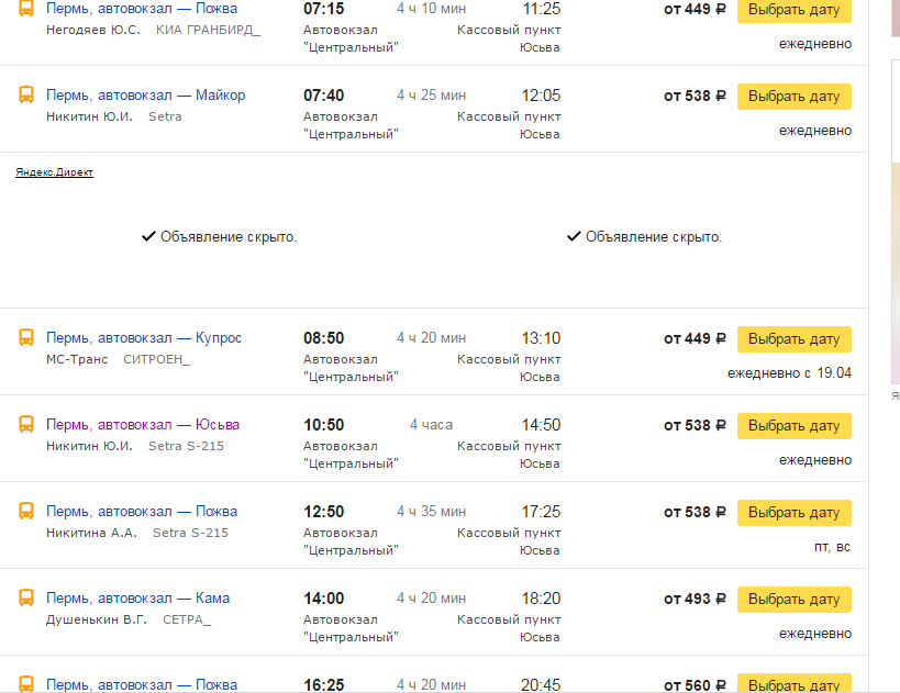 Ежедневных рейсов по данному маршруту 5, еще два автобуса отправляются через день. До пункта назначения автобус добирается примерно за 4 часа. В основном ездят большие автобусы, с местом для багажа и комфортным салоном. Поездкой я остался доволен, если не считать её длительности. Не вдохновил меня автовокзал Перми: малое количество сидений в зале ожидания, иногда натыкался на грубость персонала. Зато билеты можно купить не только в здании, но и в кассах на улице. Подробное расписание рейсов прикреплю ниже.
