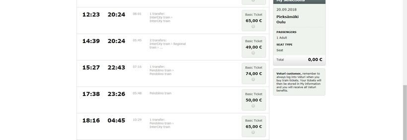 Билет от Пиексямяки до Оулу стоит 50 евро.