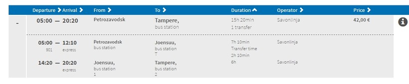 Продолжительность путешествия - от двенадцати часов и дольше. Кстати, ехать можно не только прямыми автобусами, но и с пересадками в Йоэнсуу.