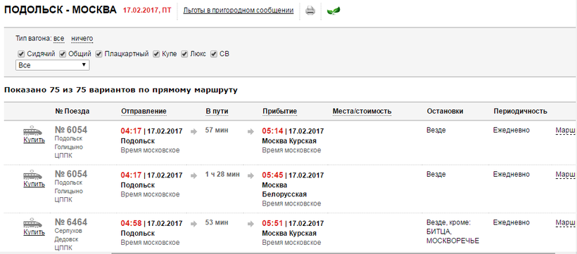 В основном все электрички из Подольска приходят на Курский вокзал, но есть исключения, к примеру, некоторые остановятся на Белорусском вокзале, но ничего страшного в этом нет. Я хочу показать расписание электричек на 17 февраля. В этот день будет около 8 рейсов, и вы можете в любое время доехать до Москвы. В среднем ехать около часа, но дорога может затянуться и на полтора часа, если электричка будет останавливаться на всех промежуточных станциях. Ну и на это же число я сразу покажу расписание поездов до Брянска, а вы видите, что будет их 12. Первый отправиться в 06:55, а последний в 23:55. Доехать до города можно за 4-6 часов.