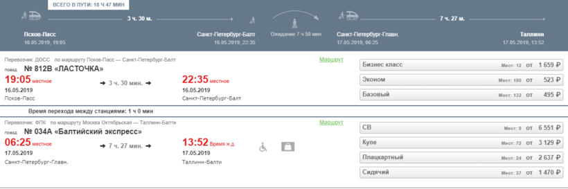 Ниже приведена информация о том, сколько часов вам потребуется, чтобы добраться от Пскова до Таллина, а также приведена примерная стоимость проезда (средняя цена билета) на том или ином виде транспорта.