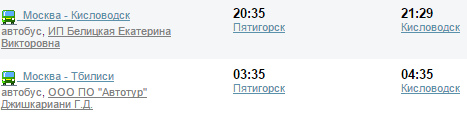 1) Москва - Тбилиси, отправление из Пятигорска в 3:35, прибытие в Кисловодск в 4:35. Периодичность - по средам.