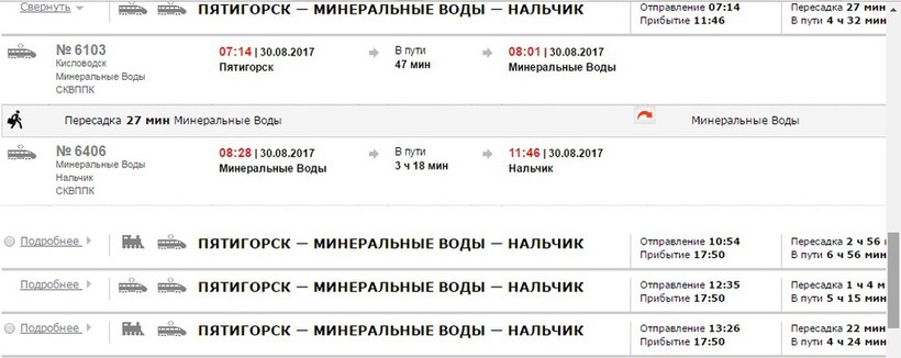Я не могу молчать об этом варианте, так как у вас должно быть что-то про запас. Здесь также точкой прибытия будет Нальчик, однако добраться до него можно только через Минеральные Воды. Ехать до них можно на электропоезде, который ездит пару раз в день (07:14, 10:54, 12:35 и 13:26). По времени поездка занимает до 50 минут. Ну а дальше вам в Водах надо будет сменить платформу и сесть на последующую электричку до Нальчика. Ходит она в 08:28 и 14:26 (2 рейса). Останется потерпеть еще 3 часа 20 минут и на этом все. Ну а потом снова такси, чтобы добраться до поселка.