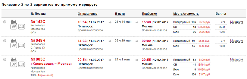 Доехать вы сможете только с пересадкой в Москве и за счет этого, время в пути, конечно же, увеличится. Железнодорожный вокзал Пятигорска находится по адресу: ул. Кирова, 1а. Чтобы вам было понятней я возьму для примера расписание на 11 февраля. Итак, в этот день будет три рейса до Москвы:
