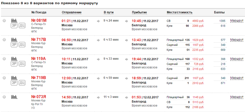 Дорога до Москвы занимает от одного дня. Предположим, что вы уже на вокзале и в этот же день есть 8 рейсов до Белгорода. Первый отправиться еще ночью в 01:21, а последний в 22:26. К счастью ехать придется вполовину меньше, чем до Москвы (6-10 часов) время будет зависеть от того на какой поезд вы сядете.