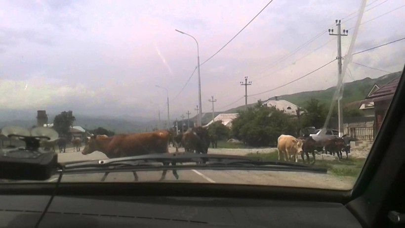 Движение по трассе очень не напряженное, а если поедете ночью, то машин почти не встретите. Но вот иногда можно наткнуться на такие вот препятствия в виде коров.