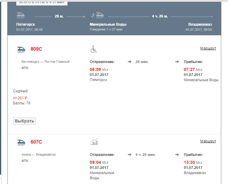 - Новороссийск — Владикавказ. Время в пути (с учетом проезда в электричке и ожидания пересадки) — 10 час. 59 мин.;