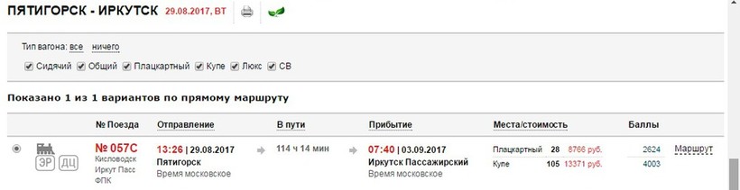 Ниже приведена информация о том, сколько часов вам потребуется, чтобы добраться от Пятигорска до Иркутска, а также приведена примерная стоимость проезда (средняя цена билета) на том или ином виде транспорта.