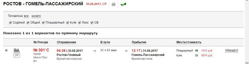 Не сказать, что этот вариант намного дороже первого, но сэкономленная тысяча всегда может пригодиться. Впрочем, здесь дело в удобстве, а заключается оно в прямом рейсе, который не требует ни пересадок, ни длительного времени в дороге. Хотя кому-то 1 день 7 часов могут показаться нескончаемыми, но поверьте, люди и по 5 суток ездят и терпят, тем более что поезд вполне приличный. Отправка всегда ночью в 04:26.