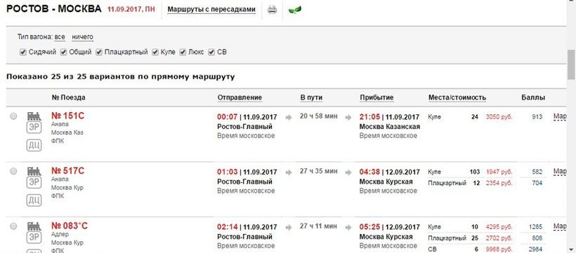 Вариант не совсем ординарный. Как бы события не развивались, вам первым делом надо доехать до Москвы, а потом уже думать, как и куда прокладывать путь дальше. Рейсы в Ростов есть на протяжение всего дня, иногда это 25 поездов в день, что довольно много. Первый уходит еще ночью в 00:07, а последний 23:45. Если повезет сесть на скоростной экспресс «Премиум», тогда доедете за 15 часов, если нет, то дорога обеспечена больше суток.