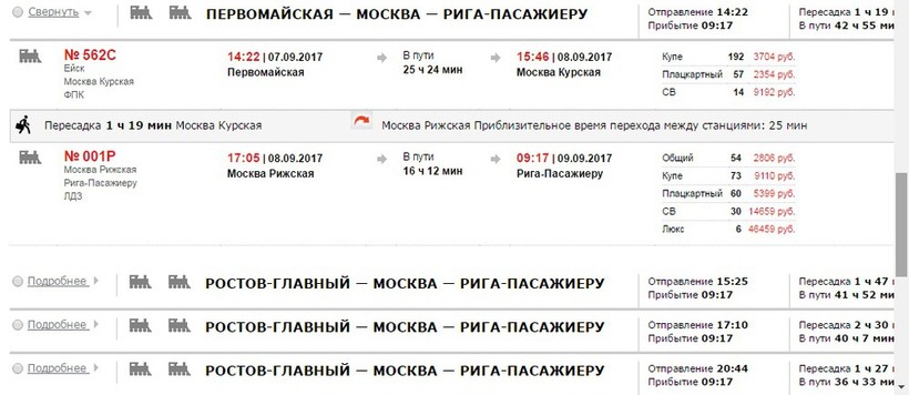 Если до столицы поезда меняют время отправки, то в Ригу практически нет (17:05, 17:10, 20:44). Доедет состав буквально за 16 часов с хвостиком. Также можете приберечь рейс в Санкт-Петербург, правда, ехать до него 1 день 15 часов, а в Ригу еще 16, поэтому я бы рекомендовала его использовать только в крайнем случае, например, когда сесть будет на другие поезда невозможно. Составы в Ригу довольно неплохие, чего нельзя сказать о поездах в Москву.