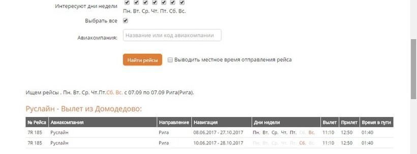 Ну а далее посадка на рейс от «Руслайн» в Ригу. Посмотрите внимательно на расписание, так как оно сезонное. Все вылеты есть в 11:10, однако с 08.06 по 27.10 они осуществляются во все дни недели кроме субботы. А вот с 10.06 по 28.10 как раз по субботам. Полет до столицы занимает неполных 2 часа и столько же до Риги.