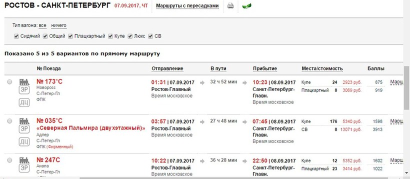 Планирование маршрута по железной дороге не совсем рациональное, так как доехать без проблем можно только до Санкт-Петербурга. Поезда до него ходят каждый день с 01:31 до 23:45. Ехать обычным составом долго, придется потратить 1 день 12 часов, но есть один фирменный поезд «Северная Пальмира», который доезжает до Главного петербургского вокзала за 1 день 4 часа, так что смотрите сами как будет удобнее, потому что проезд в таком поезде, конечно же, дороже.