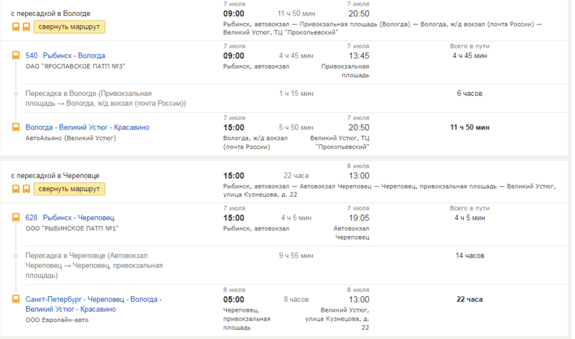 Ниже приведена информация о том, сколько часов вам потребуется, чтобы добраться от Рыбинска до Великого Устюга, а также приведена примерная стоимость проезда (средняя цена билета) на том или ином виде транспорта.