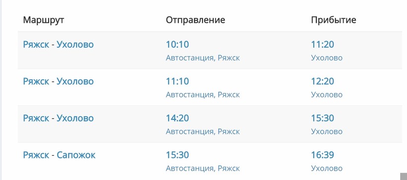 Автобусы из Ряжска в сторону Ухолово отправляются с автостанции «Ряжск», расположенной на улице Пролетарская. График движения автобусов - 6 раз в день. Время в пути - 1 час 10 минут.