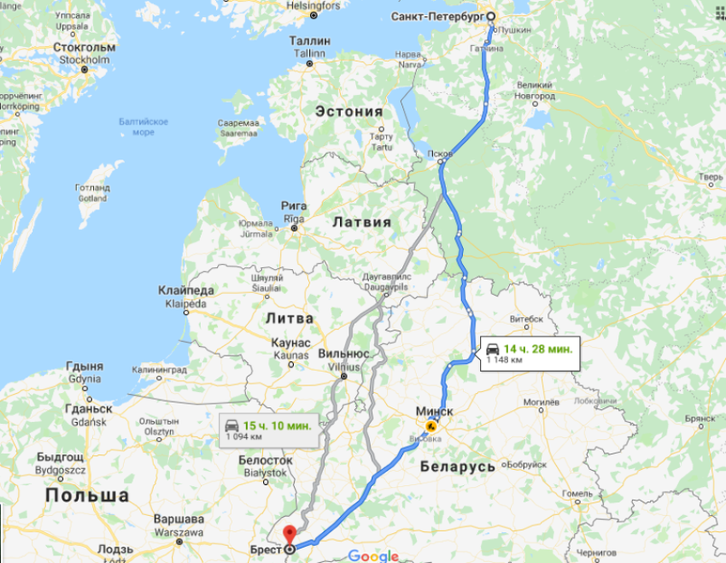Санкт-Петербург и Брест разделяет 1150 км, и проехать этот маршрут на машине можно примерно за 15 часов. Конечно, удобнее всего по маршруту ехать на собственном автомобиле, но если его у вас нет, арендовать машину в Петербурге можно, например, тут.