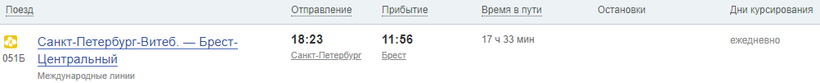 Отправляется поезд ежедневно с ж/д вокзала Петербурга «Витебский» (Загородный проспект, 52) в 18:23 и путь до Бреста преодолевает за 17,5 часов.