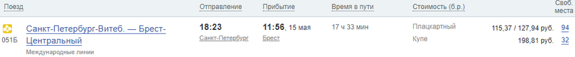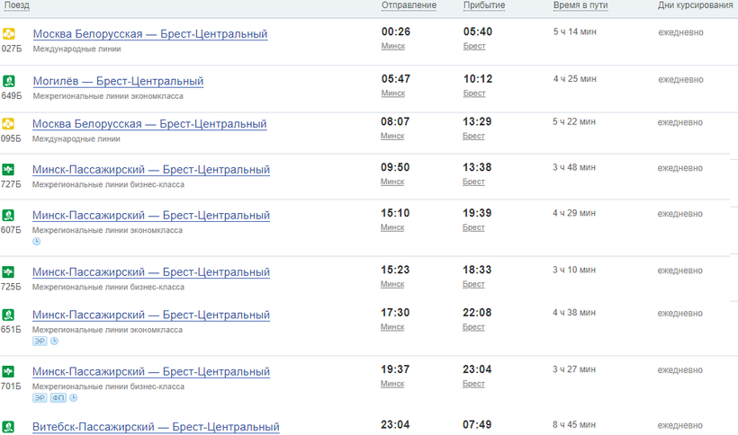 А доехать из Минска в Брест можно на поезде за 6,24 бел. руб. или 190 руб.