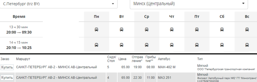 Билеты на автобусы Ecolines советую оформить на сайте компании. А вот купить билет из Петербурга в Минск на автобусы «Минсктранса» и «Петербургской транспортной компании», а также на автобус по маршруту Минск — Брест, лучше всего на сайте системы автобусных перевозок Беларуси.
