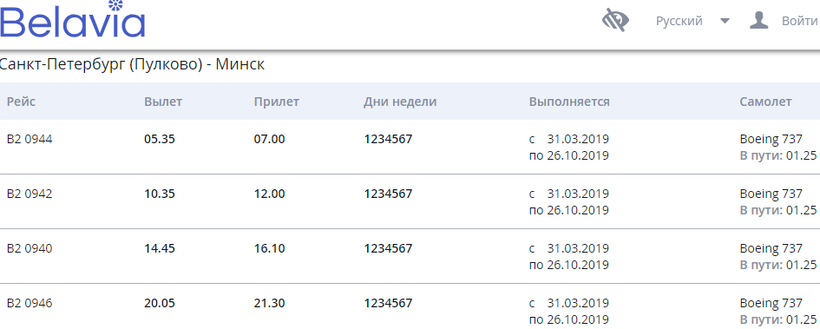 Авиарейсов из Петербурга в Брест нет, поэтому я советую долететь до Минска, куда ежедневно совершает прямые рейсы компания «Белавиа». Ее самолеты из Петербурга вылетают в 05:35, 10:35, 14:45 и 20:05 и путь до белорусской столицы преодолевают за 1 ч. 25 мин.