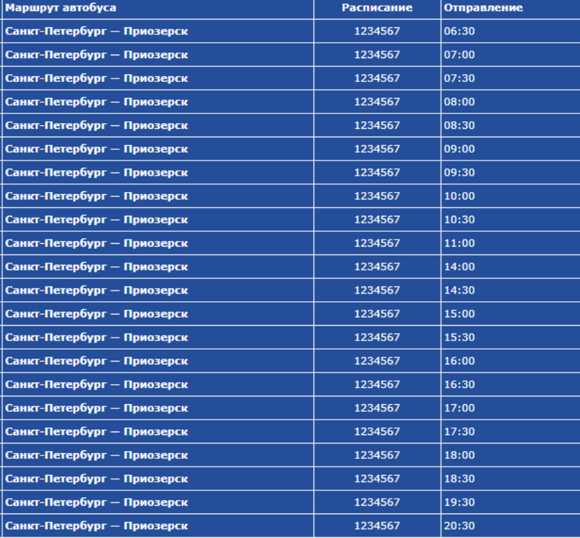 Автобусы курсируют с 06:30 утра до 20:30 вечера с интервалом в 30 минут, и путь до Приозерска они преодолевают за 2,5 часа.