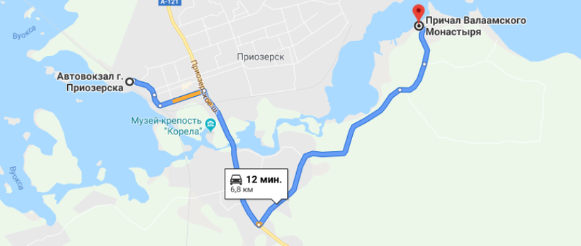 Автобусы в Приозерск прибывают на автовокзал на ул. Выборгская, 31, что в 6 км от Валаамского причала. Поэтому, чтобы не опоздать ко времени отправления теплохода, доехать до причала лучше всего на такси, что обойдется в 200 руб. и займет всего 15 мин.
