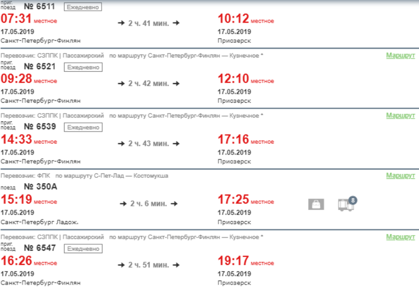 - отправление из Петербурга в 07:31 и прибытие в Приозерск в 10:12;